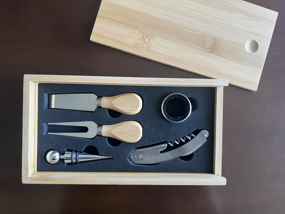- Product description: Bamboo wine service set Natural bamboo box size 24.5x13x4.5cm Internal foam padding Includes corkscrew bottle opener, stopper, wine collar & cheese knife