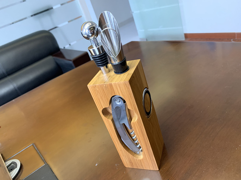 - Product description: Bamboo wine service set Includes corkscrew bottle opener, stopper, cutter, wine collar & spout with stopper Storaged in a natural bamboo magnetic housing size 55x55x155mm