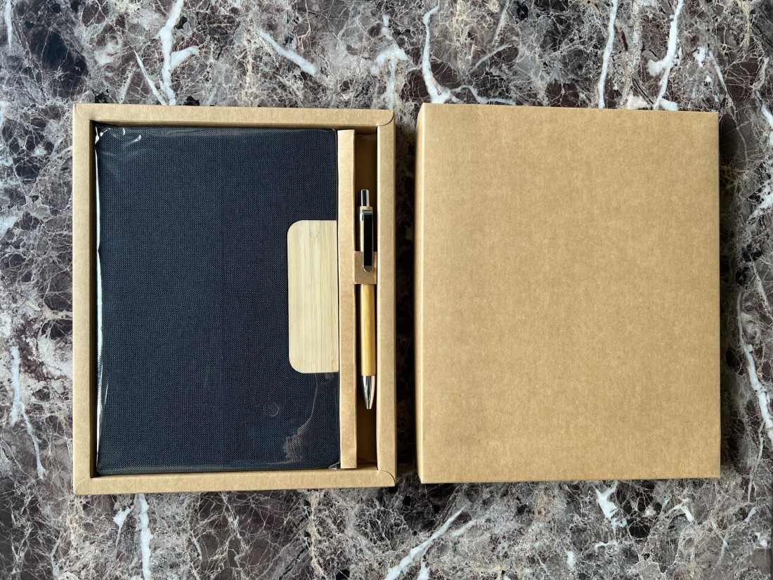 - Product description: Gift set notebook and pen Notebook A5 size 70g x 96 sheets Foldable fabric/bamboo cover for iphone/ipad stand Bamboo pen with metal clip Kraft paper gift box Size 195x240x20mm Very good item fo