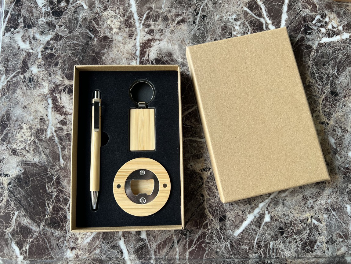 - Product description: Gift set bottle opener key holder and pen Metal/bamboo bottle opener Bamboo key holder Bamboo pen with metal clip Kraft paper gift box Size 120x190x25mm Very good item for promotional proposal