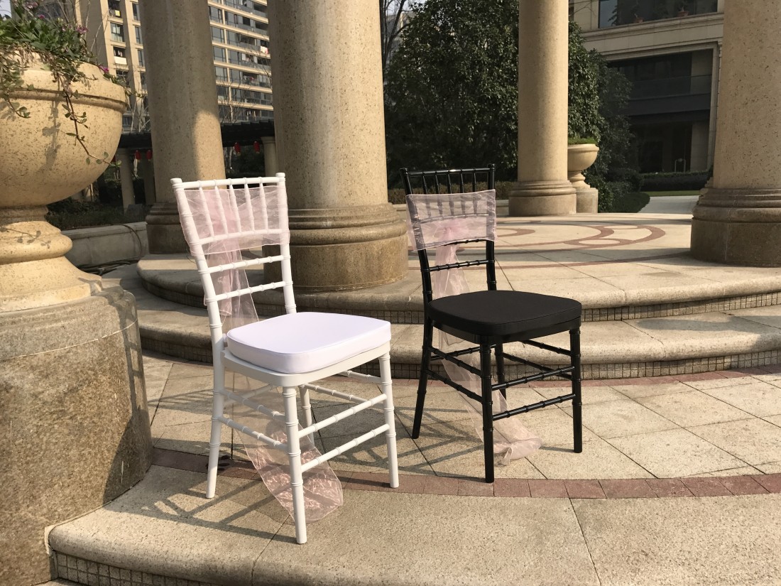 - Product description: Resin Chiavari Chair UV protected polypropylene with metal core piping One-piece design, free of screws to join chair pcs together Elegant for all kinds of events Cushions and covers avail