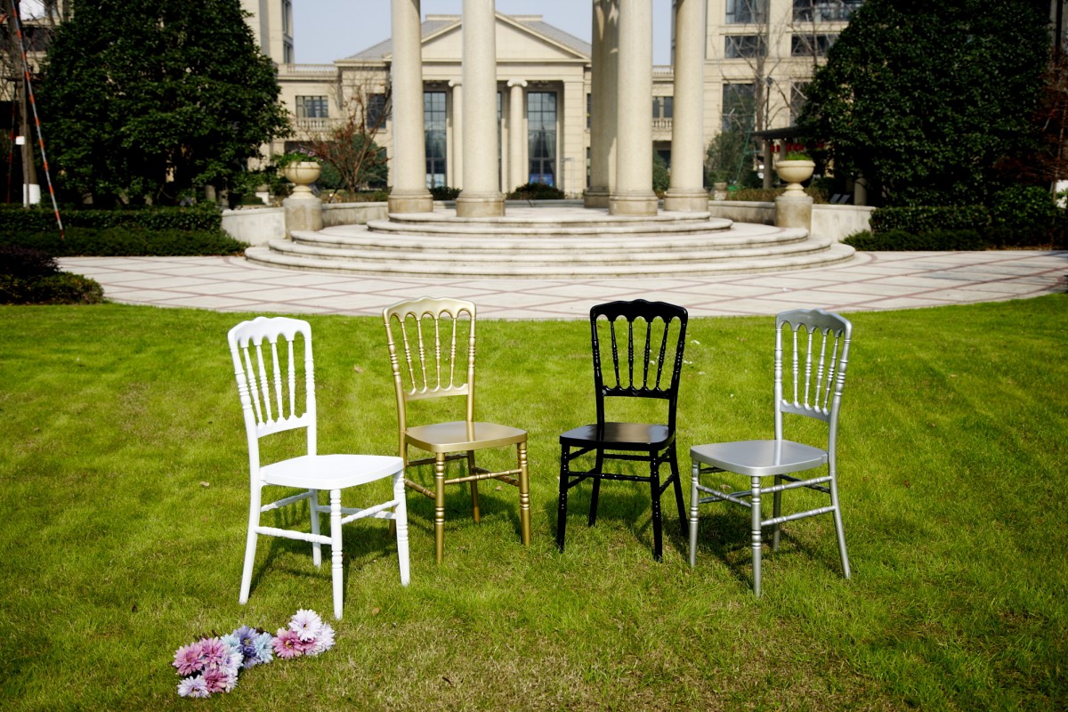 - Product description: Resin Napoleon Chair UV protected polypropylene with metal core piping One-piece design, free of screws to join chair pcs together Elegant for all kinds of events Cushions and covers avail